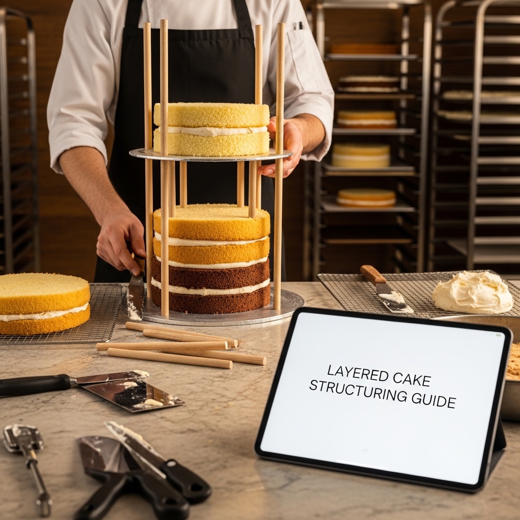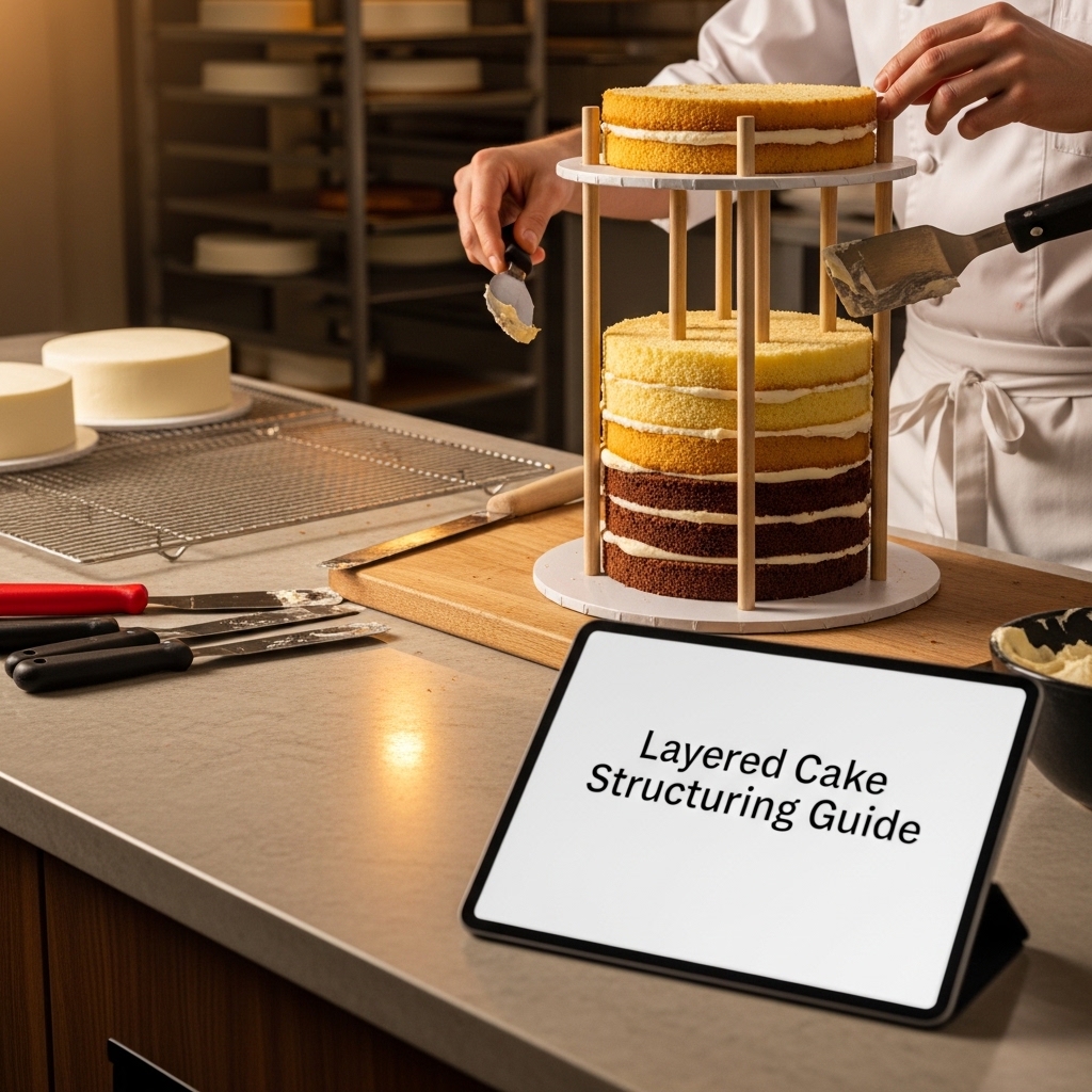 The Layered Cake Structuring Guide is a complete technical reference for the structural engineering of multi-layer and tiered cakes: doweling systems, board placement, filling management, tier assembly, transport preparation, and the troubleshooting reference for every structural failure mode that professional cake makers encounter.